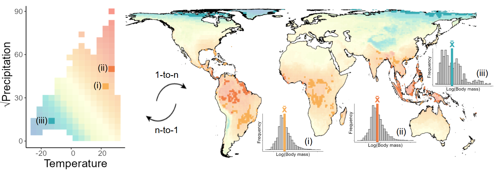 Figure 3: Hutchison’s duallity between geographical and environmental space to obtain body size patterns. More details on the framework can be found here.