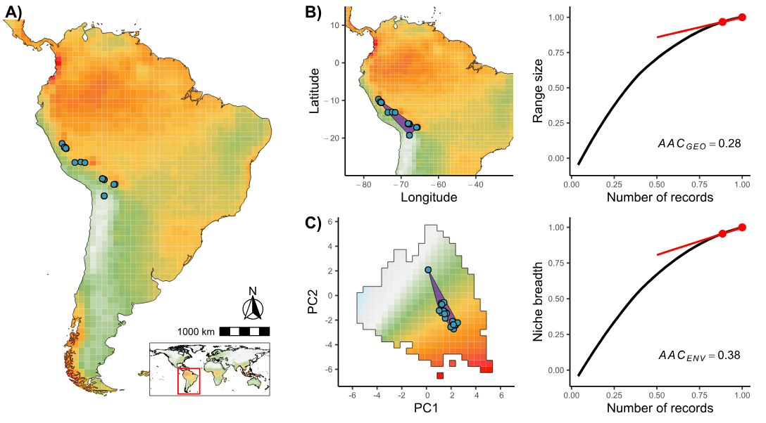 My research in this area develops methods to quantify uncertainty in biodiversity data (or its shortfalls), evaluate their general patterns, and identify the main factors influencing them. Rather than focusing on specific taxa, I address general questions and challenges that can be widely applied across the field, spanning different levels of biological organization and allowing replication by the broader scientific community. I believe my main contributions have been: (i) providing tools that allow users to estimate how reliable species range or niche estimates are given the currently available information (Araujo et al., under review); (ii) incorporating missing species information into molecular phylogenies to enable evolutionary analyses (Araujo et al., in prep); (iii) demonstrating how combining different biodiversity databases can improve our knowledge of species (Araujo et al., 2022; supervisioned Ibiapina et al., under review); and (iv) showing how our biological knowledge is biased by socioeconomic factors (Araujo & Ramos, 2021).